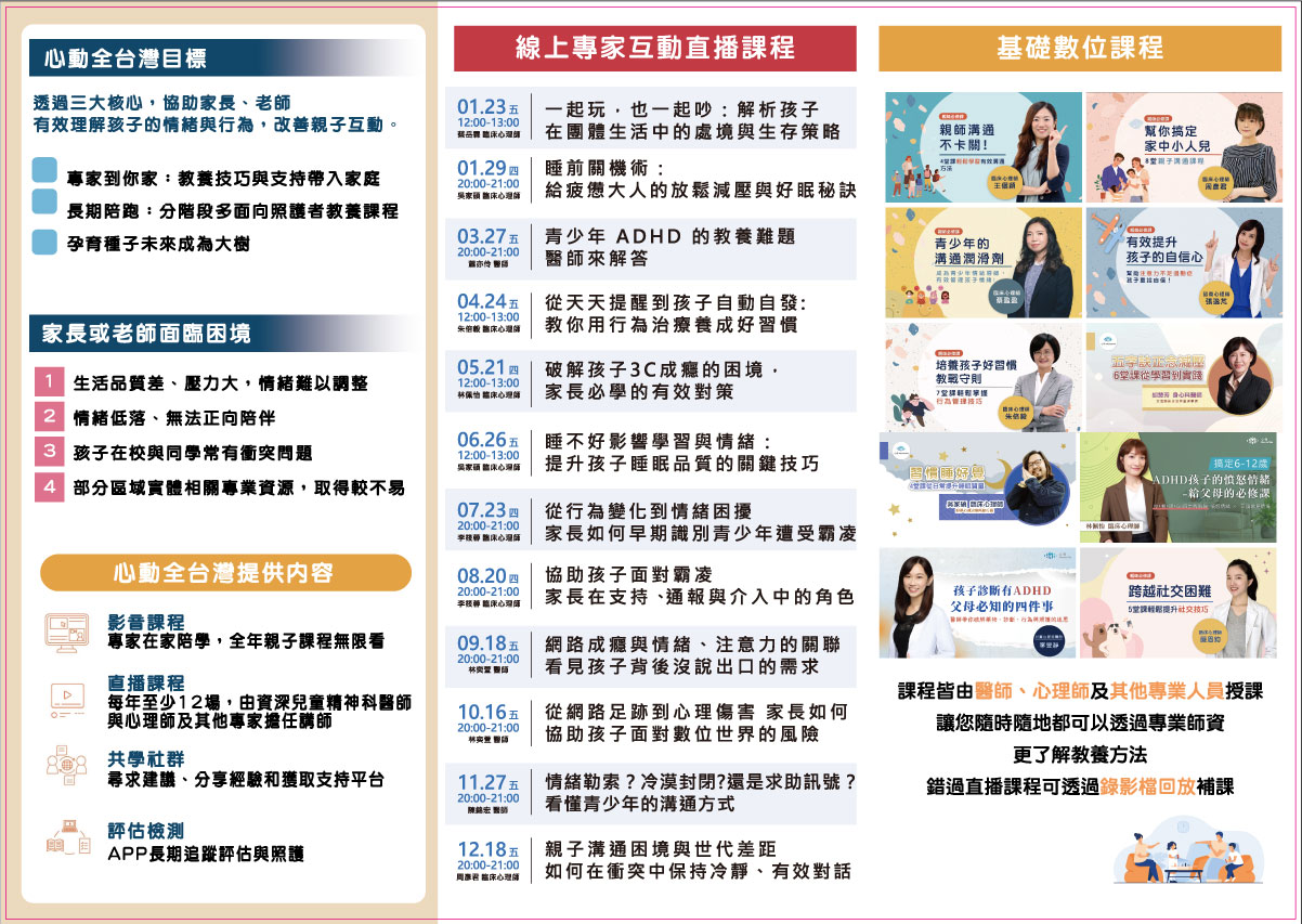 | 二、 | 本方案課程由兒童心智科醫師、臨床心理師、職能治療師等專家群共同規劃數位影音課程、專家直播課程等,詳如附件。 |